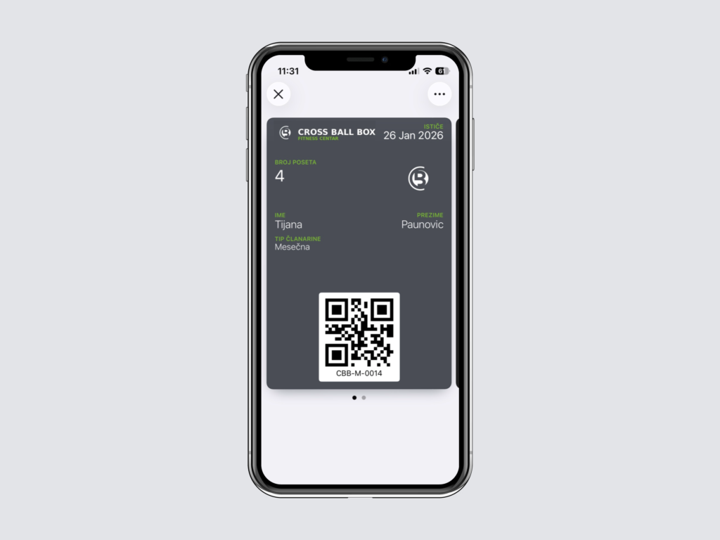 Kartica sadrži osnovne podatke o članu, vrstu članarine i rok važenja, a po potrebi može uključivati i dodatne informacije, poput broja poseta, statusa članstva ili posebnih pogodnosti, i koristi se za brzu identifikaciju, evidenciju dolazaka i proveru statusa članstva, direktno iz Apple ili Google Walleta, bez potrebe za dodatnim aplikacijama.